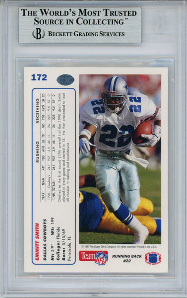 Emmitt Smith Autographed 1991 Upper Deck #172 Trading Card Beckett Slab 35082 The number in the listing title is just an inventory sku for our records and is not the authentication number. The item pictured is a stock photo unless otherwise noted. This is a football trading card that was personally autographed by Emmitt Smith. This has been professionally slabbed by Beckett Authentication Services (BAS) and includes a certificate of authenticity from Denver Autographs.