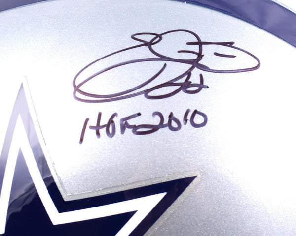Emmitt Smith Autographed F/S Dallas Cowboys Helmet w/ HOF - Beckett W Hologram *Black This is a Hand Autograph of Emmitt Smith of the Dallas Cowboys on a Riddell Football Full Size Replica Helmet. Inscribed HOF. This item has a Beckett Witness Authentication, which comes with a Beckett numbered hologram and a QR code for verification. You can view this item on the Beckett website, it shows when and where the item was signed. It was signed either at a public autograph appearance or a private signing. This is a stock photo of the item. Although you may not receive this exact item, the item you receive is virtually identical and brand new in great shape.