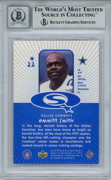 Emmitt Smith Signed 1998 UD Choice Starquest #22 Trading Card BAS 10 Slab 35088 The number in the listing title is just an inventory sku for our records and is not the authentication number. The item pictured is a stock photo unless otherwise noted. This is a football trading card that was personally autographed by Emmitt Smith. This has been professionally slabbed by Beckett Authentication Services (BAS) and includes a certificate of authenticity from Denver Autographs.