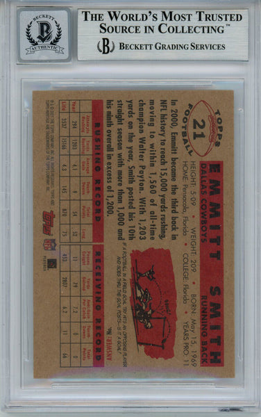 Emmitt Smith Signed 2001 Topps Heritage Trading Card Beckett 10 Slab 35096 The number in the listing title is just an inventory sku for our records and is not the authentication number. The item pictured is a stock photo unless otherwise noted. This is a football trading card that was personally autographed by Emmitt Smith. This has been professionally slabbed by Beckett Authentication Services (BAS) and includes a certificate of authenticity from Denver Autographs.
