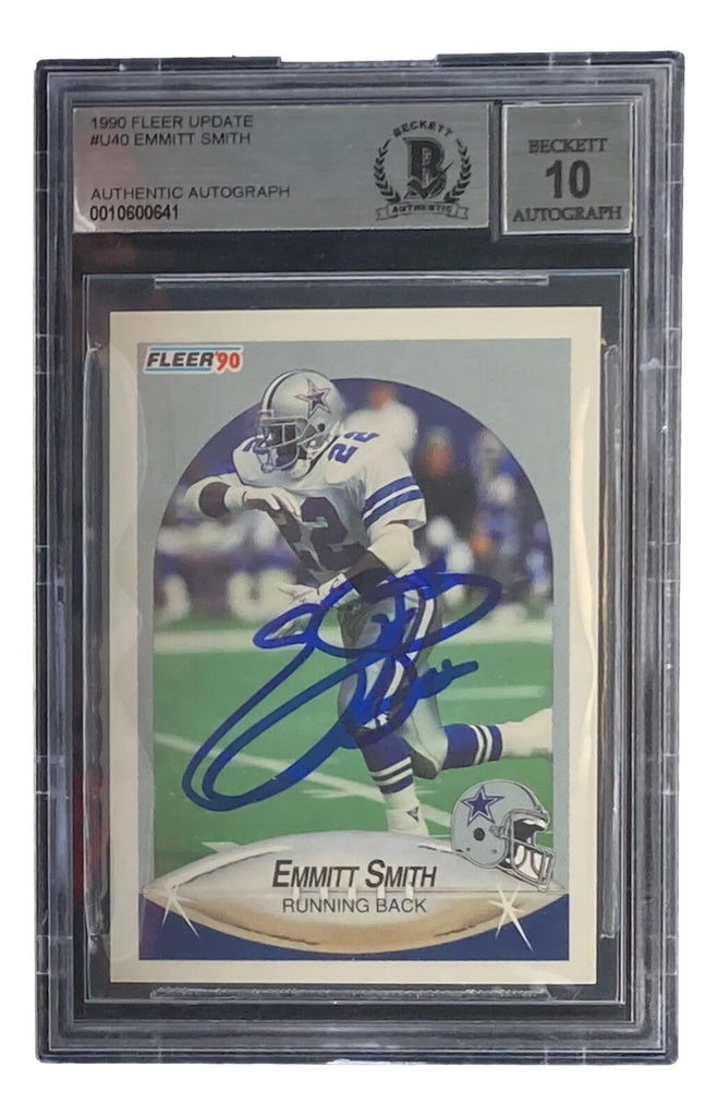 Featured is an Emmitt Smith (Dallas Cowboys) signed 1990 Fleer #U40 rookie card. This card has been hand signed by Smith and has been authenticated and encapsulated by Beckett, receiving an autograph grade of 10. This card would make a great addition to any sports memorabilia collection! SPECIFICATIONS Autographed By: Emmitt Smith Team: Dallas Cowboys Sport: Football Authentication: Beckett Grading Services