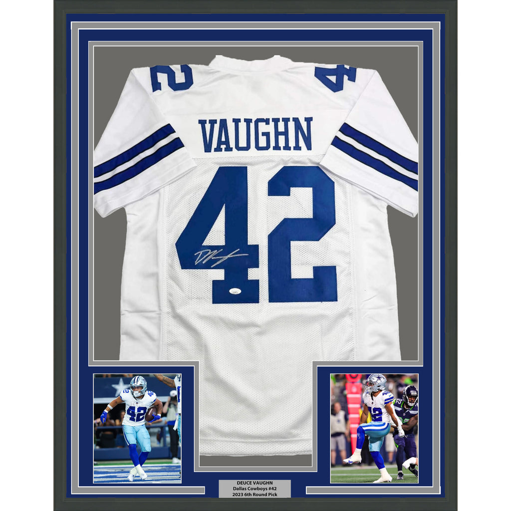 Framed Autographed/Signed Deuce Vaughn 35x39 Dallas White Jersey JSA COA The item is professionally framed and matted with two 5x7 photos, measures 35x39 inches and is ready to be hung in your man cave! Photo and matting requests can be made.