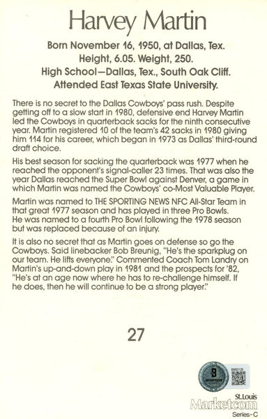 The number in the listing title is just an inventory sku for our records and is not the authentication number. This is the exact item that you will receive so please see pictures for condition. This is a mini poster measuring 8.5" x 5.5" that was personally autographed by Harvey Martin. Includes a certificate of authenticity from Beckett Authentication Services (BAS) and Denver Autographs.