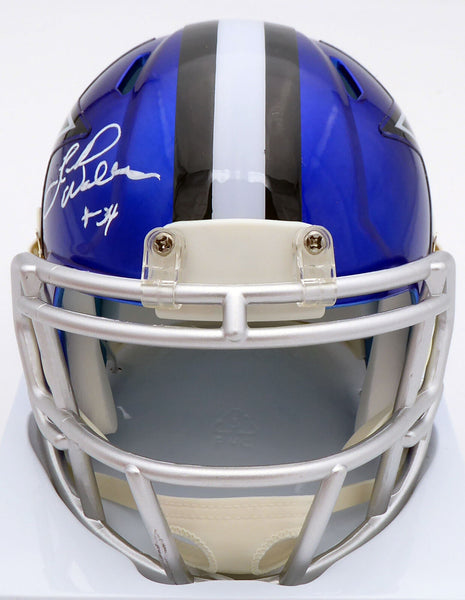This is a Dallas Cowboys Speed Flash Mini Helmet that has been hand signed by Herschel Walker.A The Flash helmets are very delicate and often have some marks or scratches on them. This item has been certified authentic by Beckett Authentication (BAS) and comes with their tamper-proof QR Code sticker that can be verified on the Beckett-authentication.com.A NOTE: There is a smudge in the auto, as shown in the pictures.