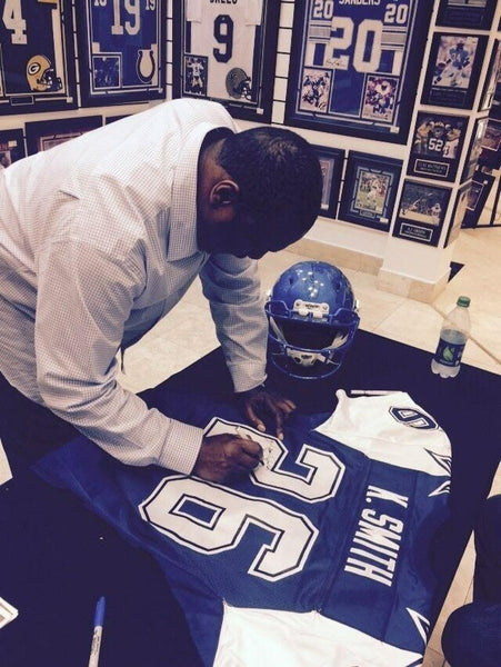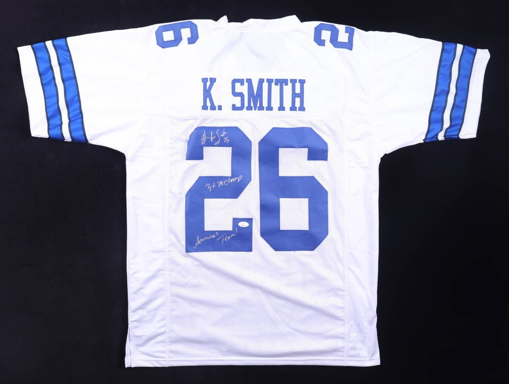 Custom on-field style jersey. Everything is sewn on, size XL. Hand-signed in black felt tip pen by Kevin Smith. The lot / autograph(s) includes an official James Spence Authentication (JSA) hologram and matching COA for authenticity purposes. The signing of this item was witnessed by JSA.Authentication: JSA COA