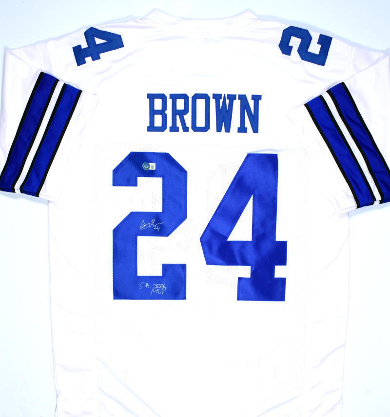 Larry Brown Autographed White Pro Style Jersey W/ SB MVP- Beckett Hologram *Silver THIS IS NOT AN NFL JERSEY. THIS HAS NO TAGS, NO LOGOS, NO EMBLEMS. This is a Hand Autographed Jersey of Larry Brown. This is Custom Made (Non Name Brand) Authentic Style (Stitched Letters and Numbers). This item has a Beckett Authentication, which Comes with a Beckett #'ed hologram and a QR code for verification. You can view this item on the Beckett website,it shows when and where the item was signed. It was signed either at a public autograph appearance or a Private Signing. This is a stock photo of the item. Although you may not receive this exact item, the item you receive is virtually identical and brand new in great shape. Jersey size is XL.