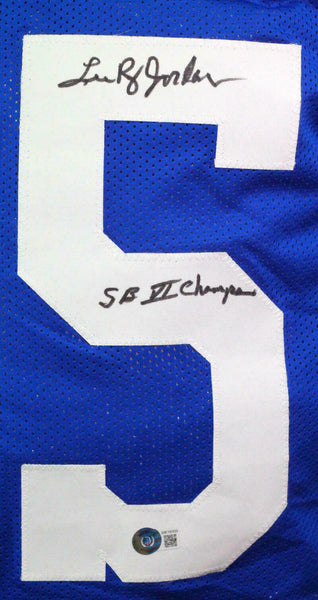 Lee Roy Jordan Autographed Blue Pro Style Jersey w/ White Num- Beckett W *Black THIS IS NOT AN NFL JERSEY. THIS HAS NO TAGS, NO LOGOS, NO EMBLEMS. This is a Lee Roy Jordan of the Dallas Cowboys hand autographed custom made (Non Name Brand) authentic style (Stitched Letters and Numbers) jersey inscribed with "SB VI Champs". This item has a Beckett Witnessed Authentication, which comes with a numbered and a matching Certificate of Authenticity. You can view this item on the Beckett website to see when and where it was signed. It was signed either at a public autograph appearance or a private signing. This is a stock photo of the item. Although you may not receive this exact item, the item you receive is virtually identical, brand new, and in great shape. Jersey size is XL.