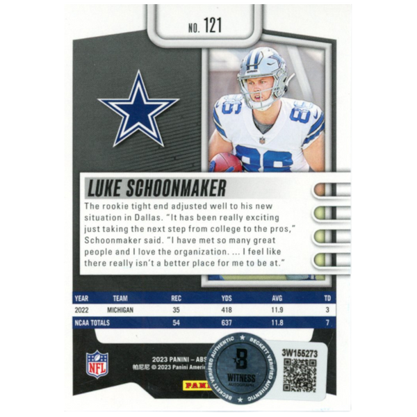 The number in the listing title is just an inventory sku for our records and is not the authentication number. The item pictured is the exact item you will receive, please see photos for condition. This is a Dallas Cowboys 2023 Panini Absolute #121 Trading Card that was personally autographed by Luke Schoonmaker. Includes a certificate of authenticity from Beckett Authentication Services (BAS) and Denver Autographs. FREE SHIPPING within the USA on orders over $10!