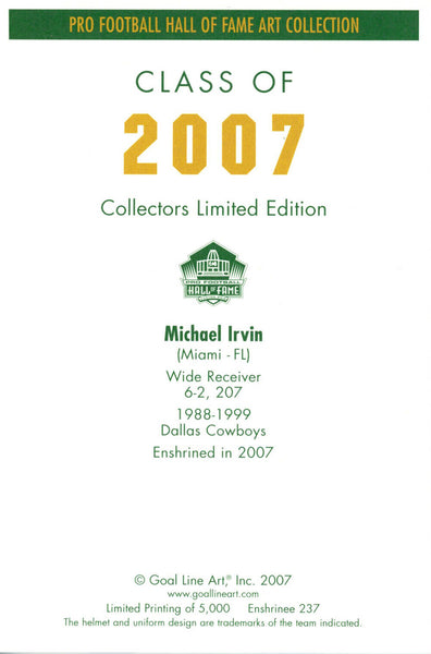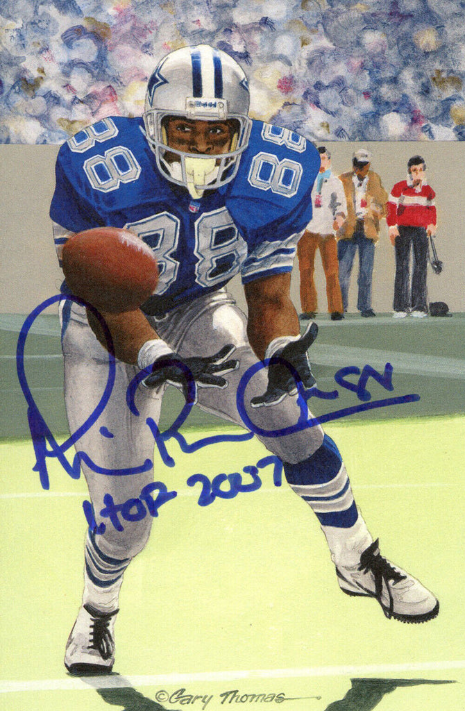 Michael Irvin Autographed/Signed Dallas Cowboys Goal Line Art Card Blue 37128 The number in the listing title is just an inventory sku for our records and is not the authentication number. The item pictured is a stock photo unless otherwise noted. This is a goal line art card that was personally autographed by Michael Irvin. Includes a certificate of authenticity from Denver Autographs.