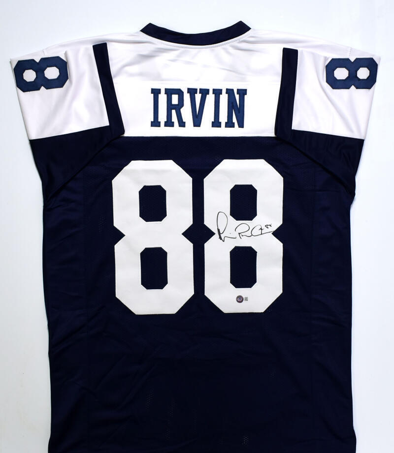 Michael Irvin Autographed White & Blue Pro Style Jersey - Beckett W Hologram *Black THIS IS NOT AN NFL JERSEY. THIS HAS NO TAGS, NO LOGOS, NO EMBLEMS. This is a Michael Irvin of the Dallas Cowboys hand autographed custom made (non name brand) authentic style jersey with stitched letters and numbers. This item has a Beckett Witnessed Authentication, which comes with a numbered hologram and a QR code for verification. You can view this item on the Beckett Authentication website. It was signed either at a public autograph appearance or a private signing. This is a stock photo of the item. Although you may not receive this exact item, the item you receive is virtually identical, brand new, and in great shape. Jersey size is XL.
