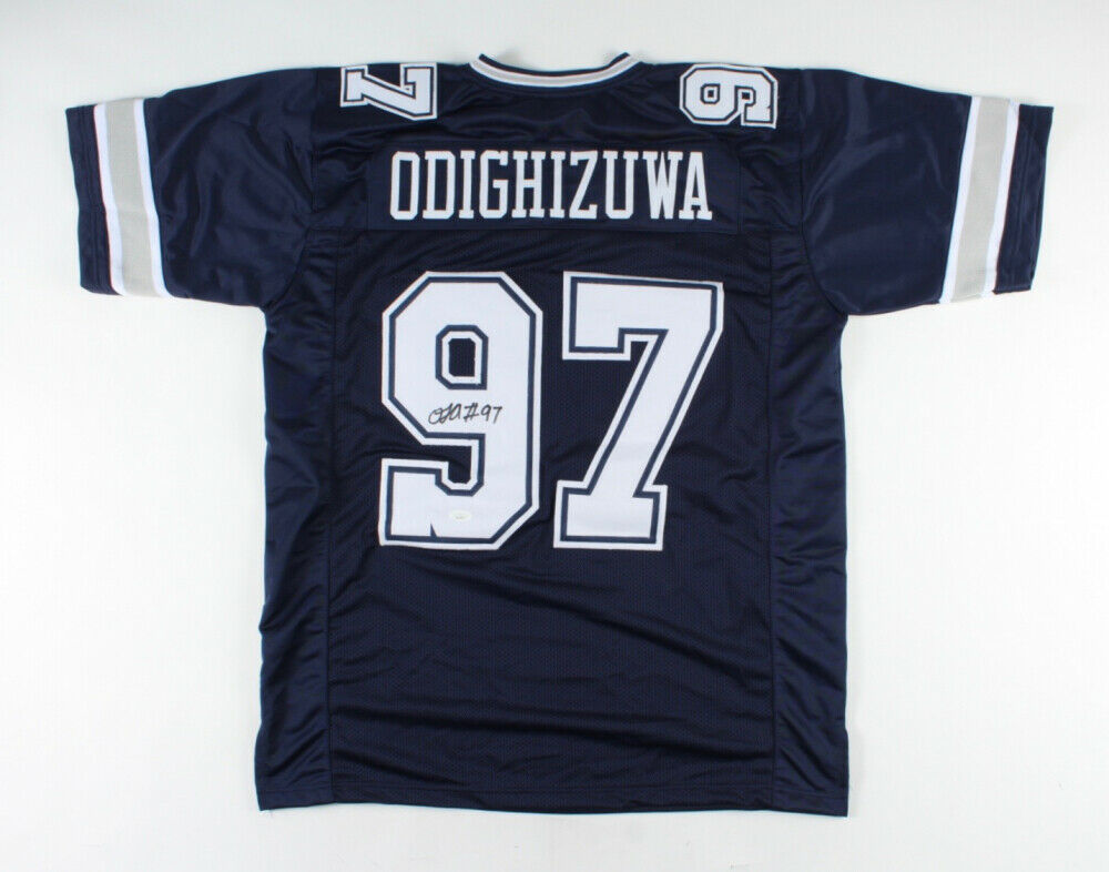 Custom on-field style jersey. Everything is sewn on, size XL. Hand-signed by Osa Odighizuwa.The autograph(s) includes an official James Spence Authentication (JSA) "Signature Debut" hologram and COA. "Signature Debut" is the autographed memorabilia equivalent to a rookie card. The JSA definition of a "Signature Debut" is as follows: "Any item that is autographed and received by JSA prior to the last game of the signer's official rookie season. Authentication: JSA COA