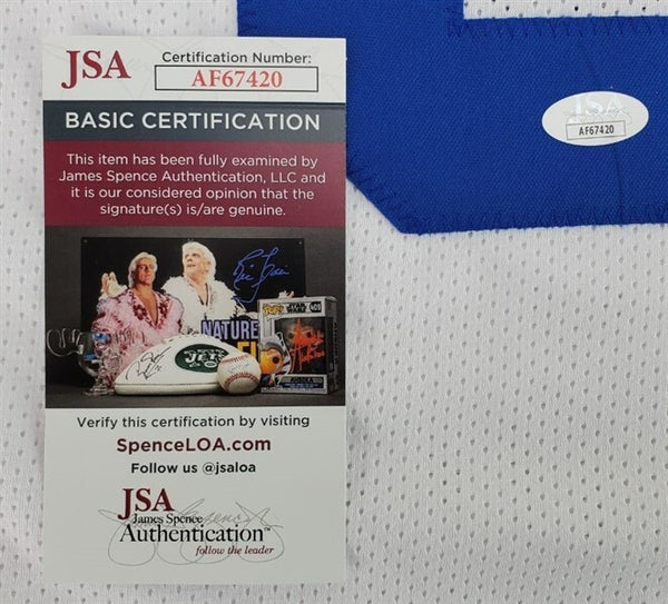 This autographed jersey has been personally hand-signed by Raghib Ismail of the Dallas Cowboys. Ismail added his nickname "Rocket" along with his signature.This autograph is certified by James Spence Authentication (JSA). It comes with the numbered hologram and matching Certificate of Authenticity.Custom on-field style jerseys are a more affordable option for autograph seekers. These jerseys do not have any brand name or tags and are made in the Philippines. They feature stitched on names and numbers and are made to look very similar to the on-field jerseys that the players wear. These custom jerseys are very commonly used in the memorabilia industry.