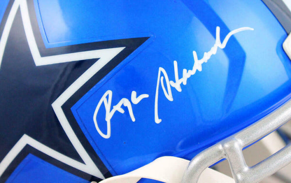 Roger Staubach Autographed Dallas Cowboys F/S Flash Speed Helmet-Beckett W Hologram *White This is a hand autograph of Roger Staubach of the Dallas Cowboys on a Riddell Football Full Size Flash Speed Replica Helmet. This item has a Beckett Witnessed Authentication, which comes with a numbered hologram and a generic coa. You can view this item on the Beckett Authentication website and it shows when and where the item was signed. It was signed either at a public autograph appearance or a private signing. This is a stock photo of the item. Although you may not receive this exact item, the item you receive is virtually identical and brand new in great shape.
