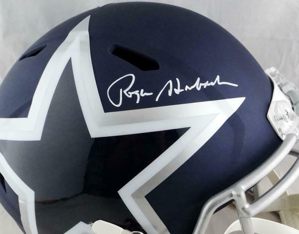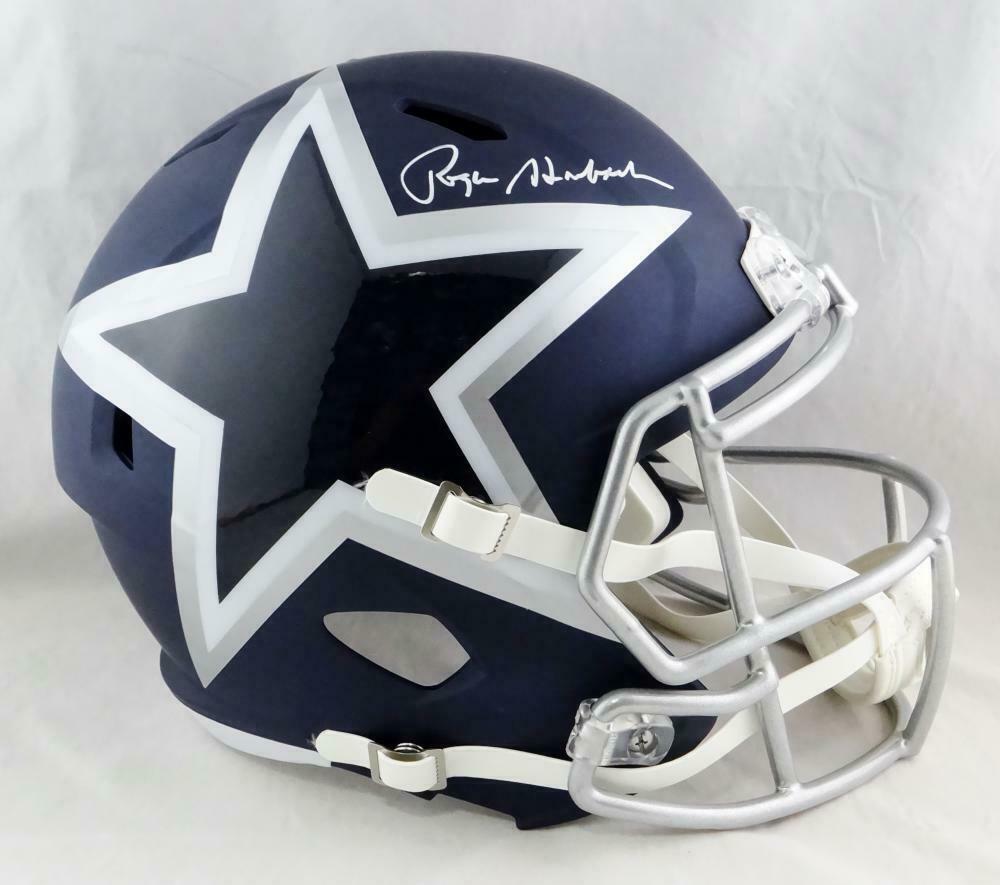 Roger Staubach Autographed F/S Dallas Cowboys AMP Speed Helmet- Beckett Auth *W This is a hand autographed Helmet of Roger Staubach of the Dallas Cowboys. This is a Riddell Football Full Size AMP Speed Replica Helmet. This item has a Beckett Authentication, which comes with a Beckett numbered and a matching Beckett Certificate of Authenticity. You can view this item on the Beckett Authentication website and it shows when and where the item was signed. It was signed either at a public autograph appearance or a private signing. This is a stock photo of the item. Although you may not receive this exact item, the item you receive is virtually identical and brand new in great shape.