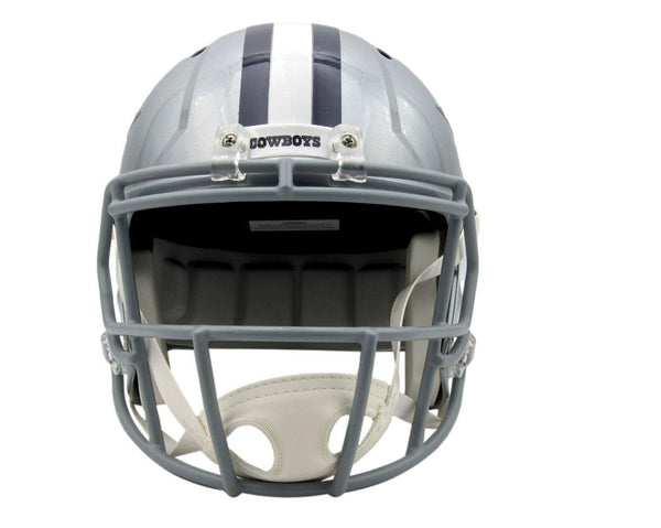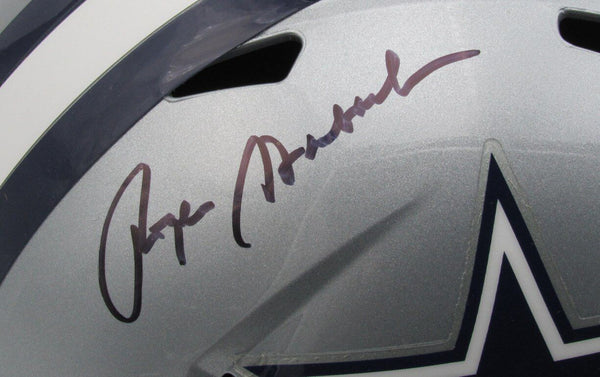 Roger staubach hof autographed silver full size speed replica football helmet dallas cowboys. this helmet is authenticated by bas/beckett and includes their tamper-proof sticker and certificate of authenticity.