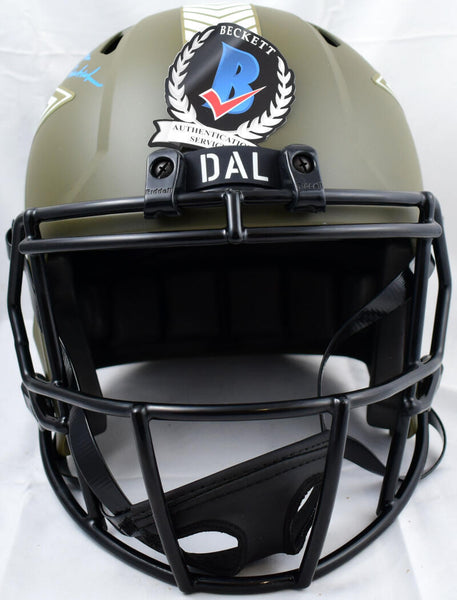 Roger Staubach Autographed Dallas Cowboys F/S Salute to Service Speed Helmet- Beckett W Hologram *Blue This is a hand autographed Helmet of Roger Staubach of the Dallas Cowboys. This is a Riddell Football Full Size Salute to Service Speed Replica Helmet. This item has a Beckett Witness Authentication, which comes with a Beckett numbered hologram and a QR code for verification. You can view this item on the Beckett Authentication website and it shows when and where the item was signed. It was signed either at a public autograph appearance or a Private Signing. This is a stock photo of the item. Although you may not receive this exact item, the item you receive is virtually identical and brand new in great shape.
