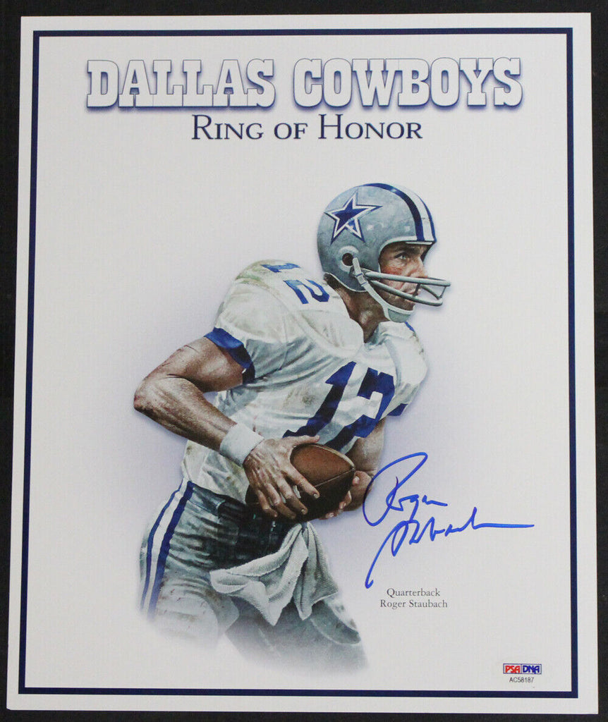 Roger Staubach Signed Dallas Cowboys 11.5x9.5 Ring Of Fame Print PSA 36484 The number in the listing title is just an inventory sku for our records and is not the authentication number. The item pictured is a stock photo unless otherwise noted. This is a 11.5 x 9.5 Ring of Fame print that was personally autographed by Roger Staubach. Includes a certificate of authenticity from Professional Sports Authentication (PSA) and Denver Autographs.