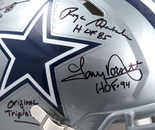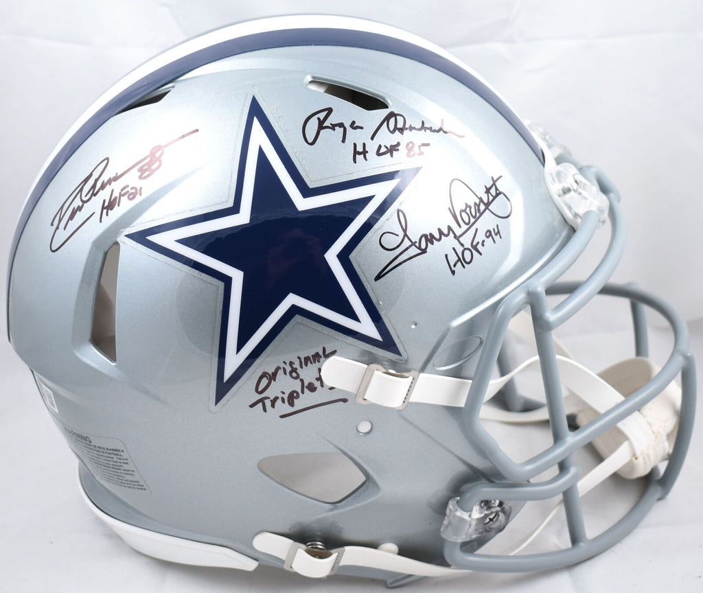 This is a Roger Staubach, Tony Dorsett, Drew Pearson of the Dallas Cowboys Autographed Riddell football full size Speed Authentic helmet. Inscribed Original Triplets and HOF. This item has a Beckett Witnessed Authentication, which comes with a numbered sticker hologram and a QR code for verification. You can view this item on the Beckett Authentication website and it shows when and where the item was signed. It was signed either at a public autograph appearance or a private signing. This is a stock photo of the item. Although you may not receive this exact item, the item you receive is virtually identical, brand new, and in great shape. *Autograph location may vary* This is a Roger Staubach, Tony Dorsett, Drew Pearson of the Dallas Cowboys Autographed Riddell football full size Speed Authentic helmet. Inscribed Original Triplets and HOF. This item has a Beckett Witnessed Authentication, which comes with a numbered sticker hologram and a QR code for verification. You can view this item on the Beckett Authentication website and it shows when and where the item was signed. It was signed either at a public autograph appearance or a private signing. This is a stock photo of the item. Although you may not receive this exact item, the item you receive is virtually identical, brand new, and in great shape. *Autograph location may vary*