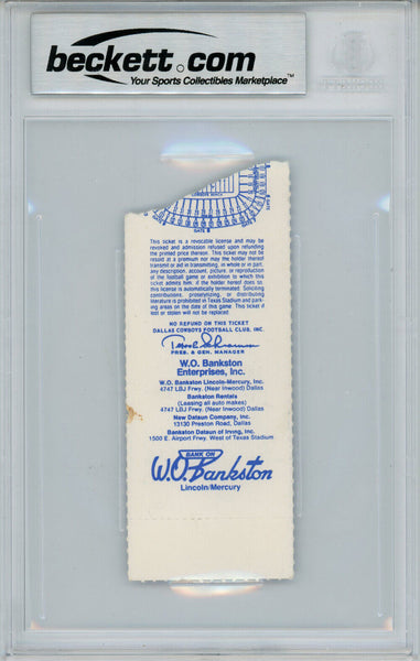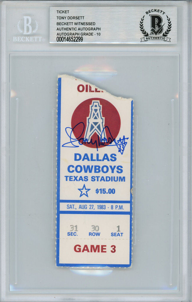 Tony Dorsett Autographed/Signed 8/27/1983 vs Oilers Ticket Beckett Slab 39183 The number in the listing title is just an inventory sku for our records and is not the authentication number. This is the exact item that you will receive so please see scans for condition. This is a official ticket that was personally autographed by Tony Dorsett. This has been professionally slabbed by Beckett Authentication Services and includes a certificate of authenticity from Denver Autographs.