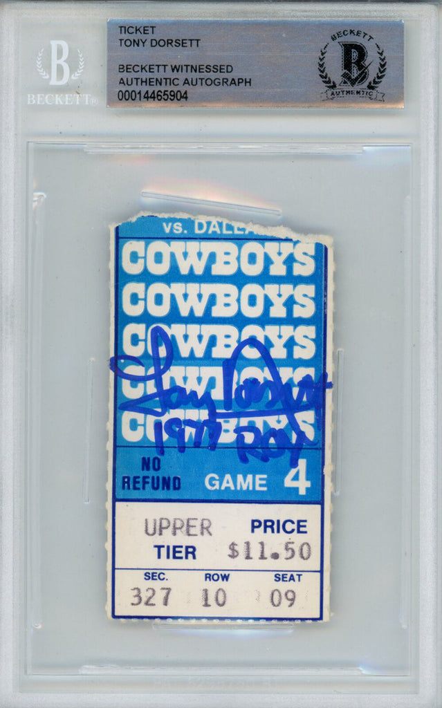 Tony Dorsett Signed Cowboys 1977 Game 4 Ticket Stub ROY Beckett Slab 38638 The number in the listing title is just an inventory sku for our records and is not the authentication number. This is the exact item that you will receive so please see pictures for condition. This is a ticket stub that was personally autographed by Tony Dorsett with ROY inscription. This has been professionally slabbed by Beckett Authentication Services (BAS) and includes a certificate of authenticity from Denver Autographs.