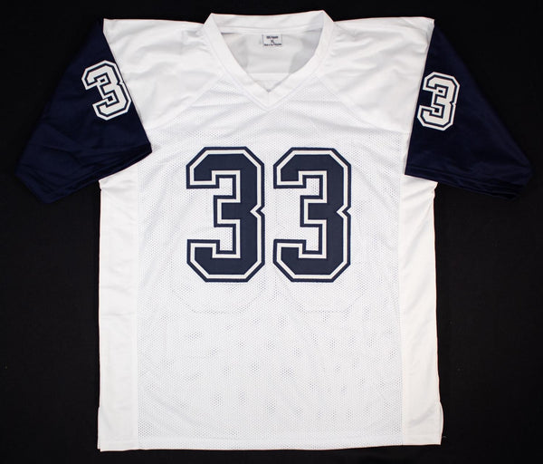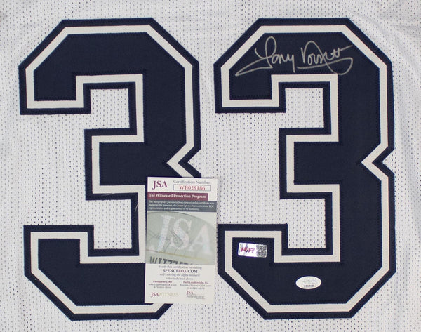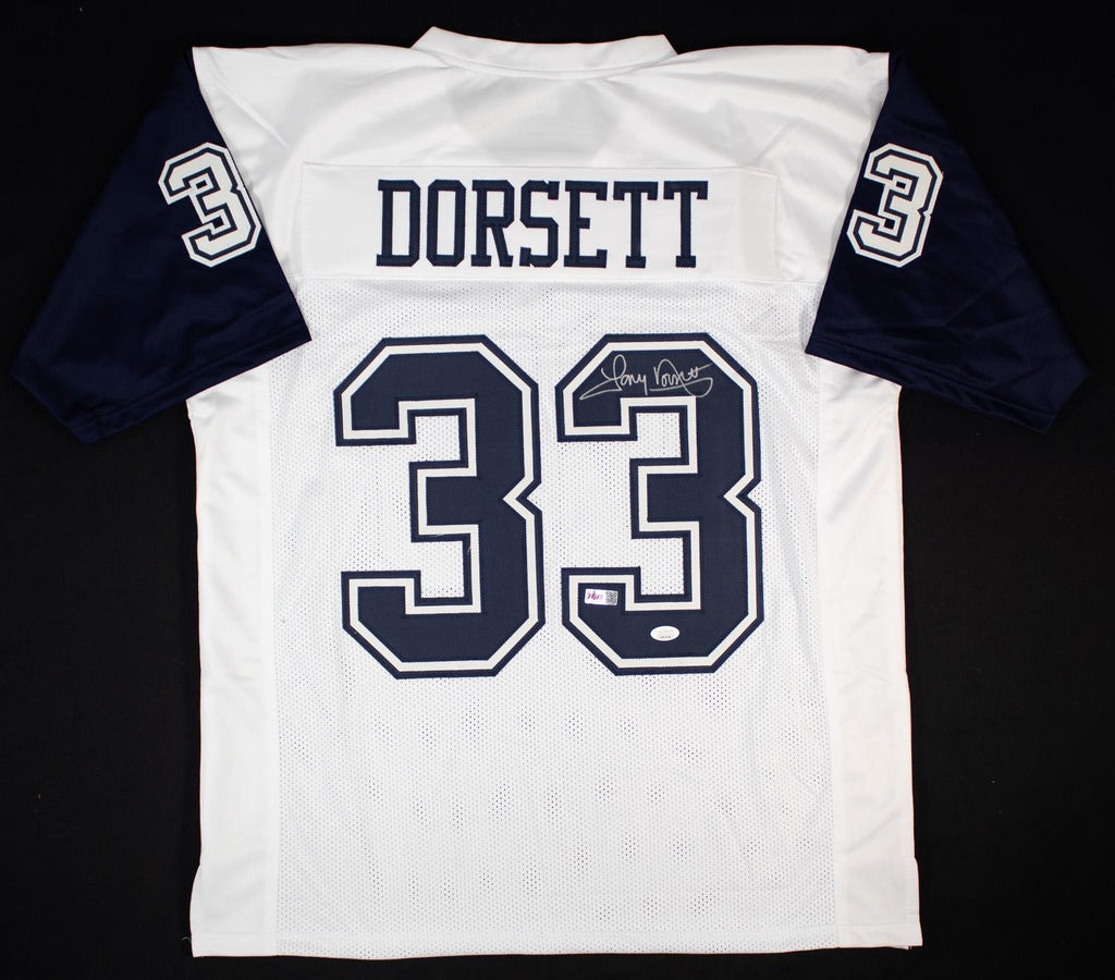 This autographed custom on-field style adult XL jersey has been personally hand-signed by Tony Dorsett of the Dallas Cowboys.This autograph is certified by James Spence Authentication's (JSA) Witnessed Protection Program. That means that a JSA representative was present when this item was signed. It comes with the numbered hologram and matching Certificate of Authenticity.