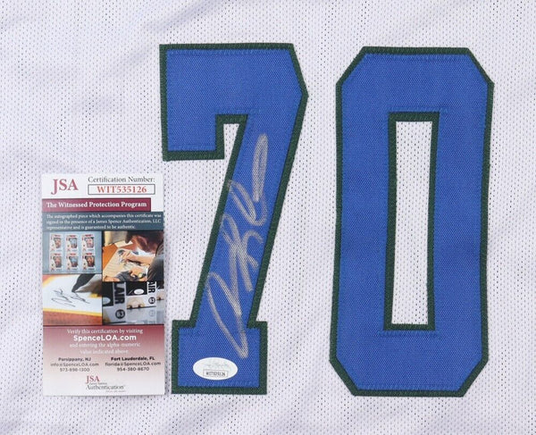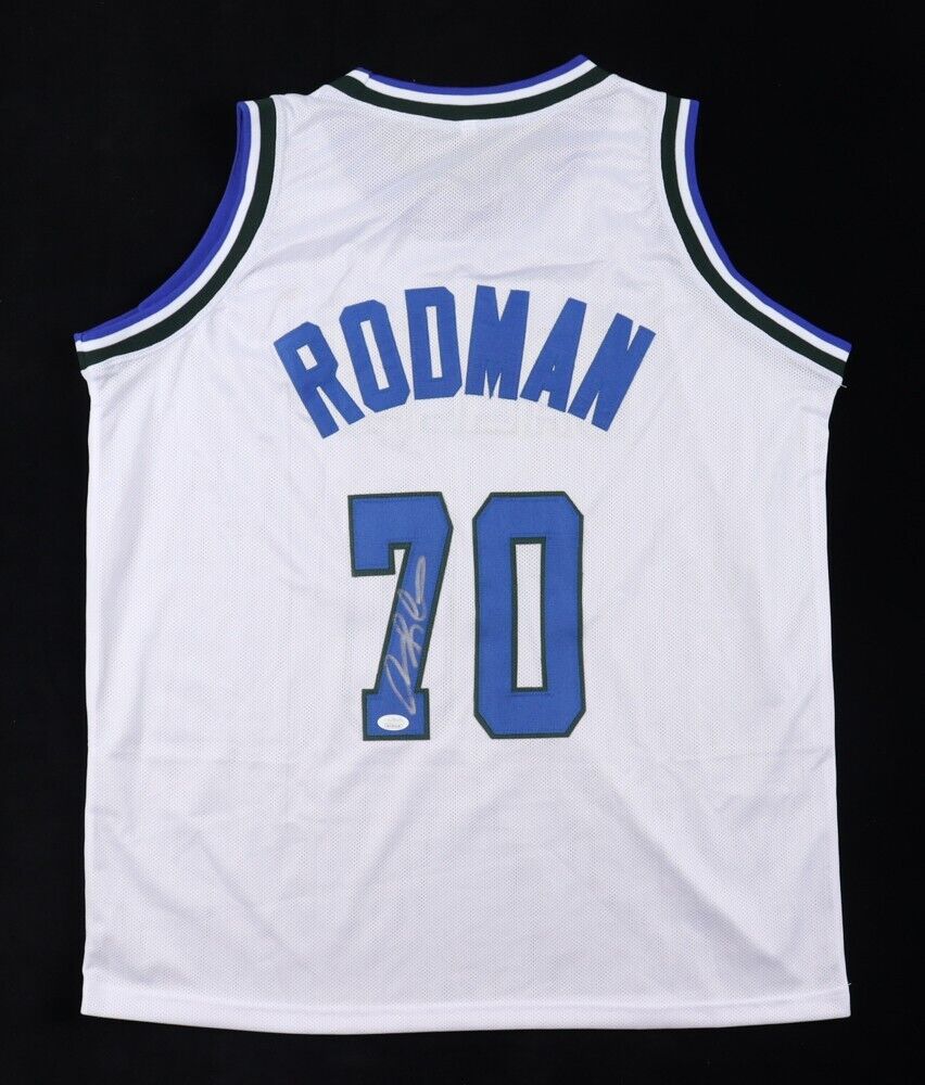 Custom on-court style jersey with everything sewn on, size XL. Hand-signed by Dennis Rodman (Detroit Pistons, San Antonio Spurs, Chicago Bulls, Los Angeles Lakers, Dallas Mavericks, HOF).When NBA commissioner David Stern saw Rodman with the jersey during the press conference, he reportedly stepped in and inform the Mavs that they wouldn't allow Rodman, or any player for that matter, to use the controversial number, Rodman then decided that he would wear jersey number 70 because according to him 69 plus one is 70. The Worm ended up playing just 12 games in Dallas, then retiring from the NBA in 2000.The autograph includes an official Beckett Authentication Services serially numbered hologram for authenticity purposes.Authentication: Beckett Hologram
