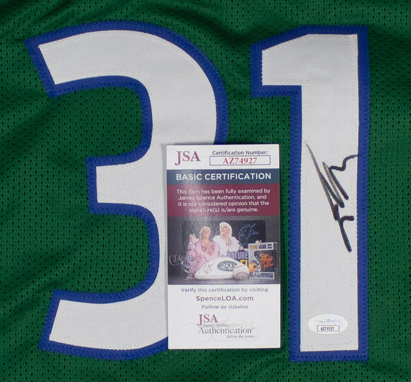 This autographed custom on-court style adult XL jersey has been personally hand-signed by Jason Terry of the Dallas Mavericks.This autograph is certified by James Spence Authentication (JSA). It comes with the numbered hologram and matching Certificate of Authenticity.Custom on-court style jerseys are a more affordable option for autograph seekers. These jerseys do not have any brand name or tags and are made in the Philippines. They feature stitched on names and numbers and are made to look very similar to the on-field jerseys that the players wear. These custom jerseys are very commonly used in the memorabilia industry.