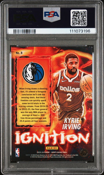 This Autographed 2023 Hoops Ignition #8 Card has been Personally Signed by Kyrie Irving of the Dallas Mavericks. This item is 100% Authentic, it comes slabbed and authenticated by PSA/DNA. The authenticity can be verified on Professional Sports Authenticator website.