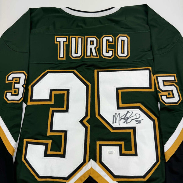 Autographed/Signed Marty Turco Dallas Green Hockey Jersey JSA COA Jersey has no brand names or logos. This is a custom jersey and was not manufactured by or in any manner associated with any professional sports league or manufacturer. This custom jersey carries no professional sports league designation. The item is intended to be an autographed collectible. The custom jersey displays the name and number of the player. This item in no way is affiliated with or connected to any professional sports organization. Size is XL.