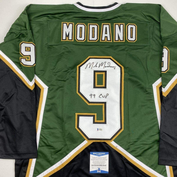 Autographed/Signed Mike Modano 99 Cup Dallas Dark Green Jersey Beckett BAS COA This is a custom jersey and was not manufactured by or in any manner associated with any professional sports league or manufacturer. This custom jersey carries no professional sports league designation. The item is intended to be an autographed collectible. Reference of team in the title is to allow the purchaser a point of association. The custom jersey displays the name, number and authenticated signature of the player. This item in no way is affiliated with or connected to any professional sports organization. The autograph, as always is guaranteed to be authentic and has been certified as authentic by a third-party, trusted authenticator. Size is XL unless otherwise noted.
