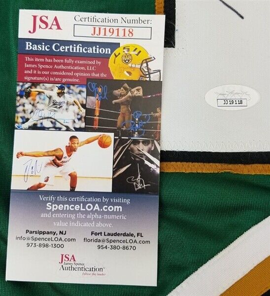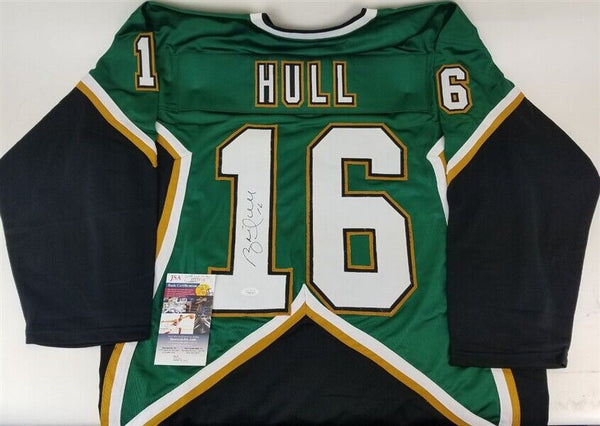 This autographed custom on-ice style adult XL jersey has been personally hand-signed by Brett Hull of the Dallas Stars.This autograph is certified by James Spence Authentication (JSA). It comes with the numbered hologram and matching Certificate of Authenticity.Custom on-ice style jerseys are a more affordable option for autograph seekers. These jerseys do not have any brand name or tags and are made in the Philippines. They feature stitched on names and numbers and are made to look very similar to the on-field jerseys that the players wear. These custom jerseys are very commonly used in the memorabilia industry.