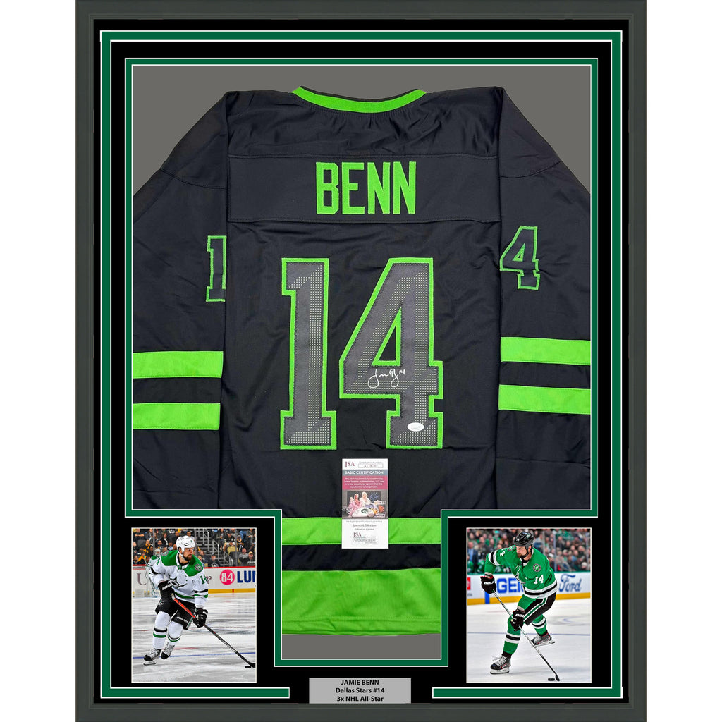Framed Autographed/Signed Jamie Benn 35x39 Dallas Black Hockey Jersey JSA COA The item is professionally framed and matted with two 5x7 photos, measures 35x39 inches and is ready to be hung in your man cave! Photo and matting requests can be made.