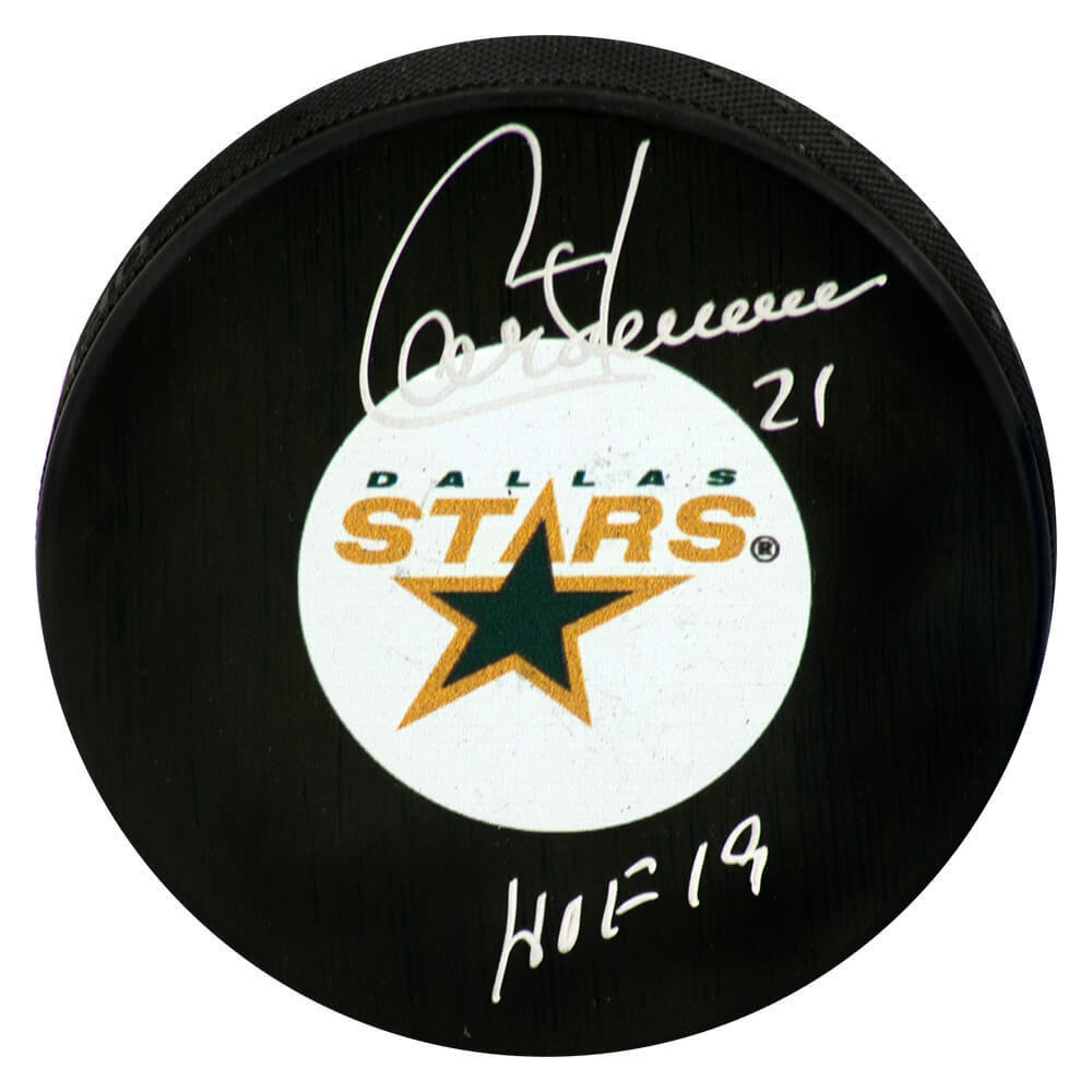 Guy Carbonneau signed Dallas Stars logo hockey puck with 'HOF 19' inscription. Item comes with a Schwartz Sports Memorabilia tamper-proof numbered hologram and Certificate of Authenticity which can be verified online.