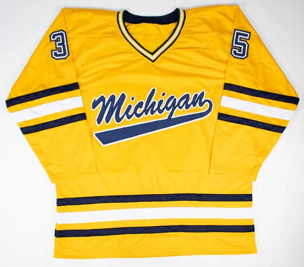 This autographed Custom on-ice style adult XL jersey has been personally hand-signed by Marty Turco of the Michigan Wolverines. When signing, Turco Inscribed "CCHA R.O.Y '95", "NCAA Champ 96 & 98", and "'98 M.O.P" along with his signature.This autograph is certified by James Spence Authentication's (JSA) Witnessed Protection Program. That means that a JSA representative was present when this item was signed. It comes with the numbered hologram and matching Certificate of Authenticity.Custom on-ice style jerseys are a more affordable option for autograph seekers. These jerseys do not have any brand name or tags and are made in the Philippines. They feature stitched on names and numbers and are made to look very similar to the on-field jerseys that the players wear. These custom jerseys are very commonly used in the memorabilia industry.