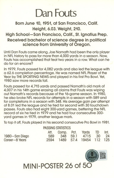 The number in the listing title is just an inventory sku for our records and is not the authentication number. This is the exact item that you will receive so please see pictures for condition. This is a mini poster measuring 8.5" x 5.5" that was personally autographed by Dan Fouts. Includes a certificate of authenticity from Beckett Authentication Services (BAS) and Denver Autographs.