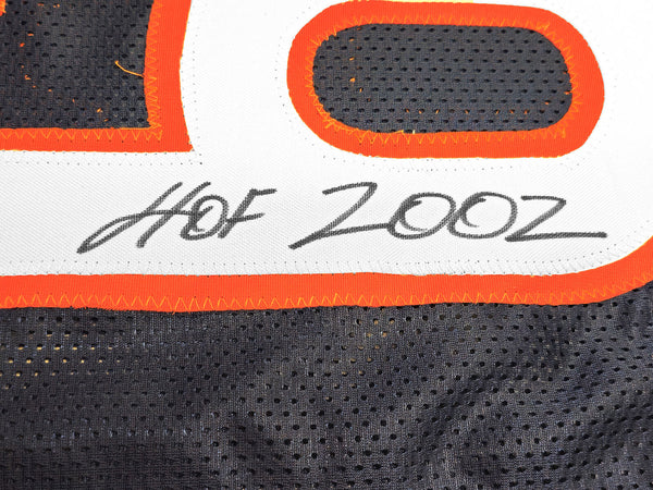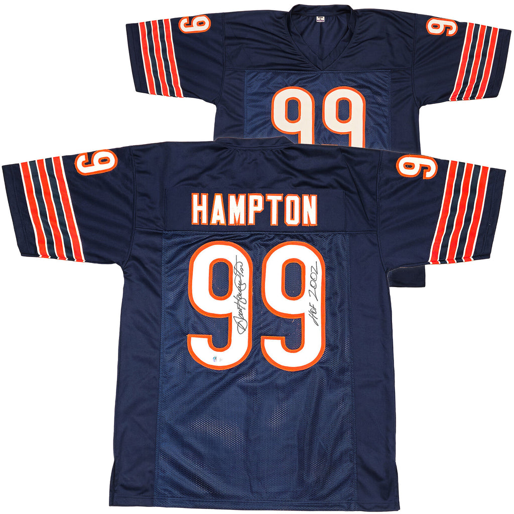 This is a Blue Jersey that has been hand signed by Dan Hampton. This is a custom jersey with no name brand. The approximate size is XL. It has nice sewn in name and numbers. This item was inscribed "HOF 2002." This item has been witnessed and certified authentic by Beckett Authentication (BAS) and comes with their tamper-proof witness sticker.