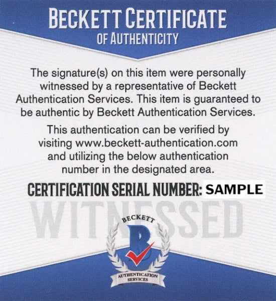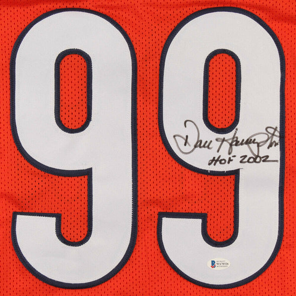 Custom on-field style jersey. Everything is sewn on, size XL. Hand-signed and inscribed in black felt-tip pen by Dan Hampton (HOF). The lot / autograph(s) includes an official Beckett Authentication Services serially numbered hologram and matching COA for authenticity purposes. The signing of this item was witnessed by Beckett.Authentication: Beckett COA