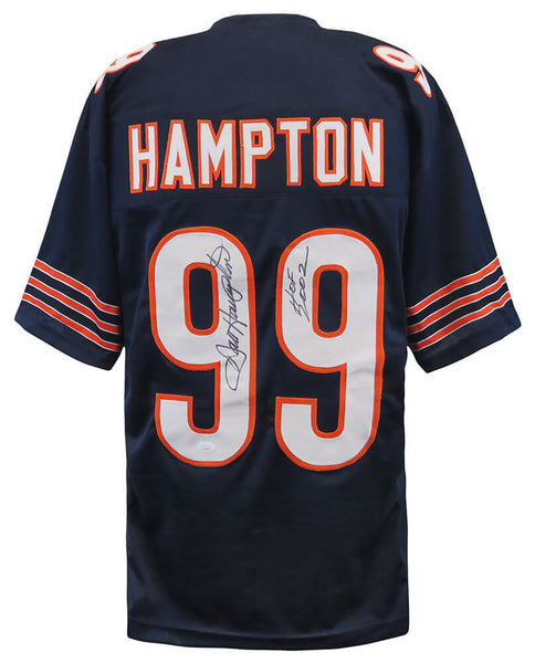 Dan Hampton signed navy custom football jersey with 'HOF 2002' inscription. Item comes with a JSA (James Spence Authentication) tamper evident numbered sticker and matching Certificate of Authenticity which can be verified online. Jersey is size XL.
