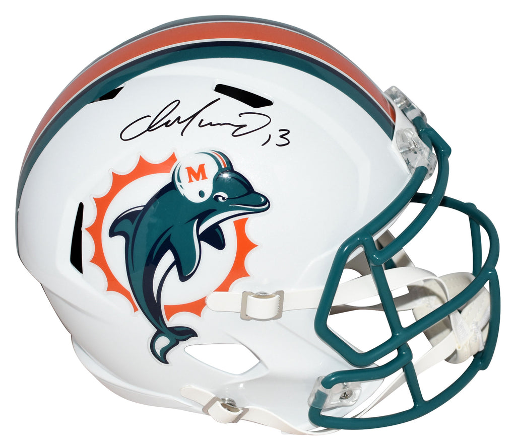 Dan Marino, former Hall of Fame quarterback for the Miami Dolphins, has hand signed this Dolphins Riddell Speed full-size replica helmet at a private signing. This item is authenticated by Beckett Authentication Services and was signed in the presence of one of their representatives. Their tamper-evident hologram featuring a QR code and serial number is on the item. The authenticity can be verified online by entering the serial number or scanning the QR code.Item pictured may not be the exact item you will receive. It will be similar quality, and we guarantee your satisfaction.