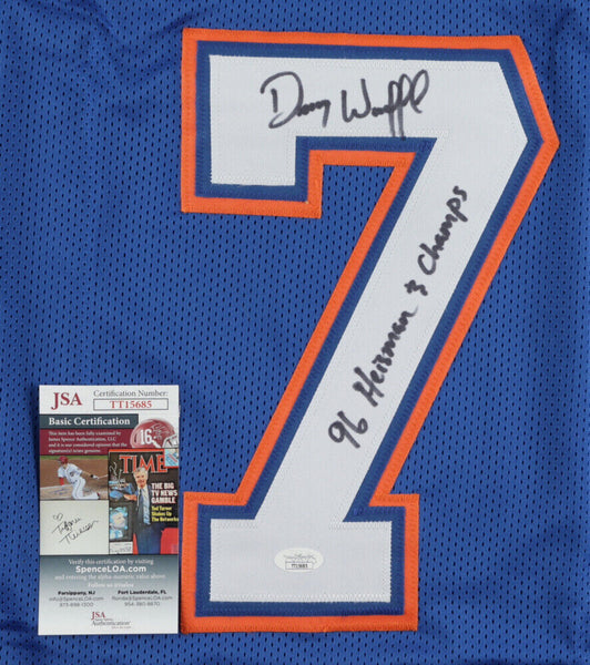 Custom on-field jersey. Everything sewn on, size XL. Hand-signed and inscribed by Danny Wuerffel (Florida Gators).The lot / autograph(s) includes an official James Spence Authentication (JSA) hologram and matching COA for authenticity purposes.Authentication: JSA COA