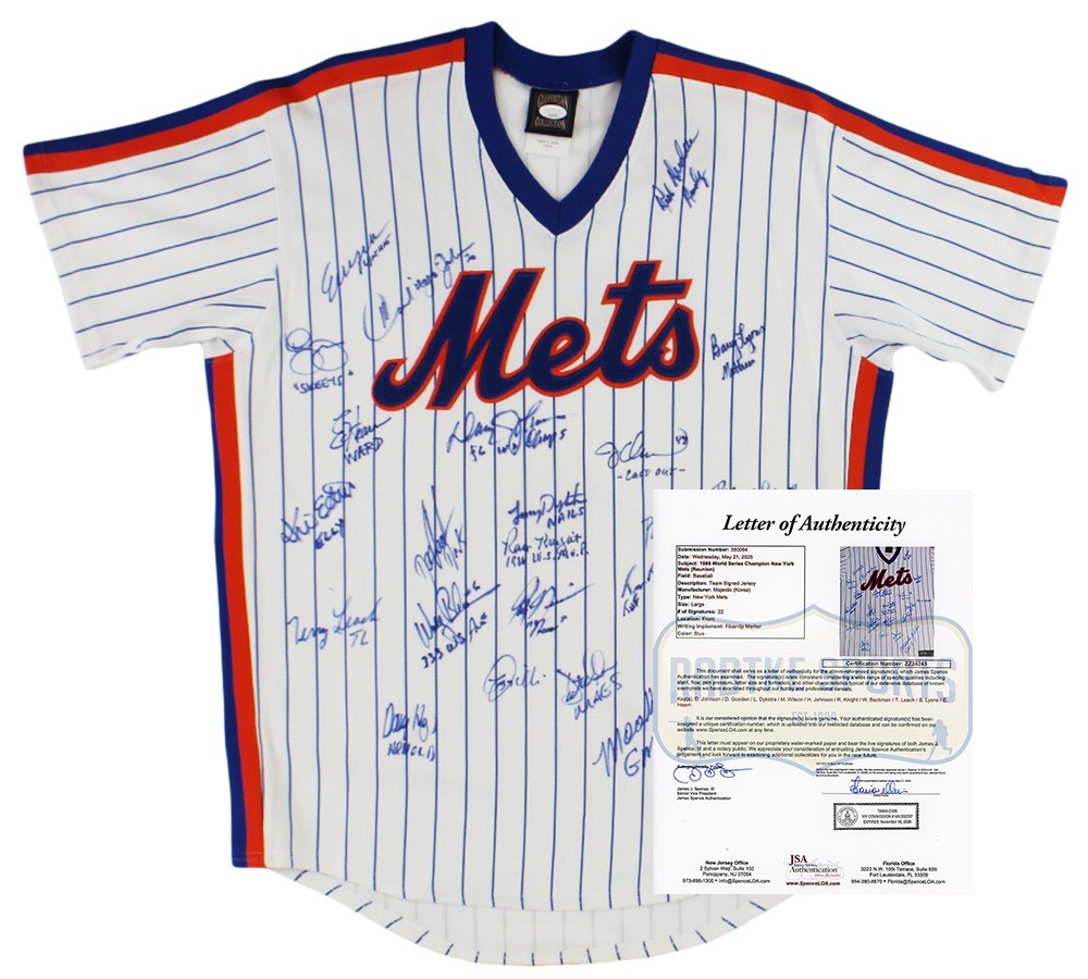 A New York Mets Majestic Pinstripe MLB Jersey hand signed by 22 1986 New York Mets Team Alumni including: Ray Knight, Davey Johnson, Darryl Strawberry, Howard Johnson, Sid Fernandez, Terry Leach, Barry Lyons, Wally Backman, Bob Ojeda, Doc Gooden, Roger McDowell, Tim Teufel, Denny Dykstra, Rafael Santana, Dave Magadan, Kevin Mitchell, Jesse Orosco, Mookie Wilson & Ed Hearn. The signatures and item are in excellent condition. AUTHENTICATION: The item is accompanied by JSA Letter of Authenticity - JSA Serial Numbered and Databased Hologram
