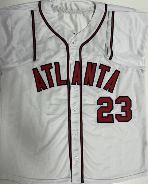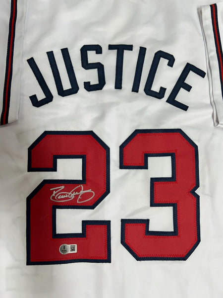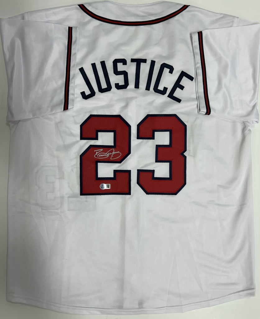 Custom replica jersey of Atlanta Braves All Star DAVID JUSTICE. This jersey is signed with Silver Paint Pen. This jersey is size XL with all letters and numbers sewn in. This item would make a great addition to any Cubs collection. This autograph is guaranteed to be 100% authentic and will include a COA from Beckett Authentication.