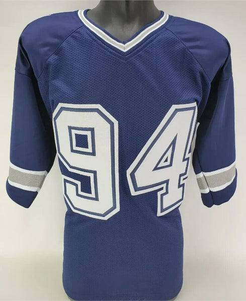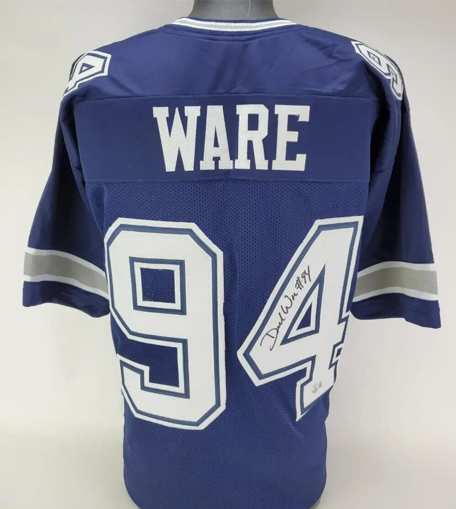 Custom on-field style jersey. Everything sewn on, size XL. Hand-signed in black Sharpie pen by DeMarcus Ware.This autograph is certified by Beckett Authentication Services (BAS) Witness Certification. That means that a Beckett representative was present when this item was signed. It comes with the numbered authentication scannable hologram with a QR code card that verifies the authentication on the Beckett website.