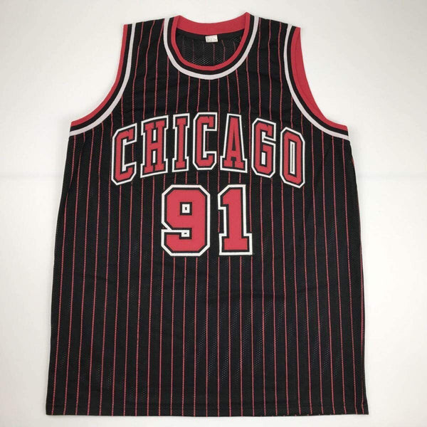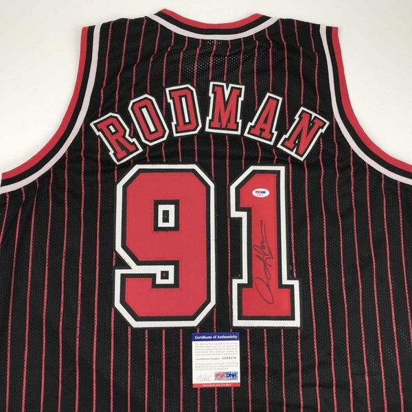 Autographed/Signed DENNIS RODMAN Chicago Pinstripe Basketball Jersey PSA/DNA COA This is a custom jersey and was not manufactured by or in any manner associated with any professional sports league or manufacturer. This custom jersey carries no professional sports league designation. The item is intended to be an autographed collectible. Reference of team in the title is to allow the purchaser a point of association. The custom jersey displays the name, number and authenticated signature of the player. This item in no way is affiliated with or connected to any professional sports organization. The autograph, as always is guaranteed to be authentic and has been certified as authentic by a third-party, trusted authenticator. Size is XL unless otherwise noted.