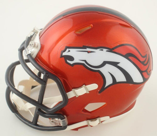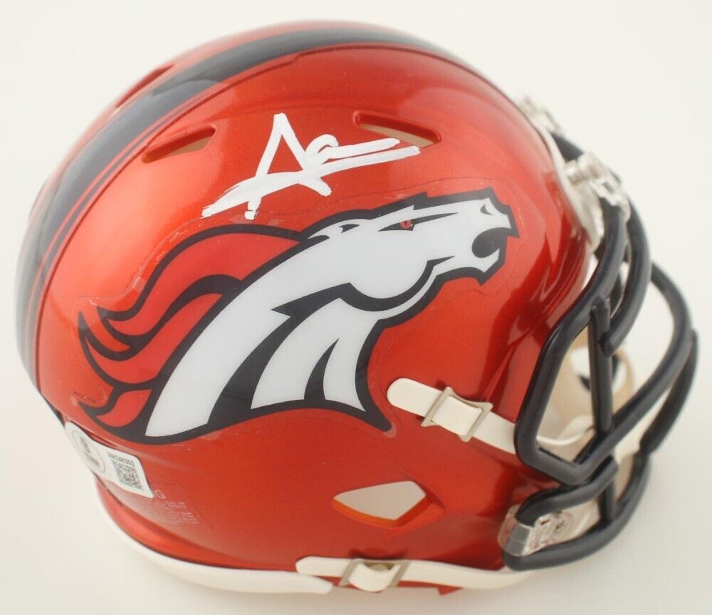 Riddell Denver Broncos Speed mini helmet. Hand-signed by Audric Estime.The autograph includes an official Beckett Authentication Services serially numbered hologram and QR code card for authenticity purposes. The signing of this item was witnessed by Beckett.Authentication: Beckett Hologram with QR code card