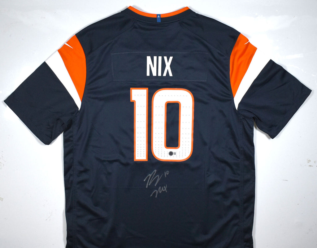 This is a Hand Autographed Nike Game Jersey of Bo Nix of the Denver Broncos. This item has a Beckett Witnessed Authentication, which Comes with a Beckett #'ed hologram and a QR code for verification. You can view this item on the Beckett website and it shows when and where the item was signed. It was signed either at a public autograph appearance or a Private Signing. This is a stock photo of the item. Although you may not receive this exact item, the item you receive is virtually identical and brand new in great shape. Jersey size is XL. This is a Hand Autographed Nike Game Jersey of Bo Nix of the Denver Broncos. This item has a Beckett Witnessed Authentication, which Comes with a Beckett #'ed hologram and a QR code for verification. You can view this item on the Beckett website and it shows when and where the item was signed. It was signed either at a public autograph appearance or a Private Signing. This is a stock photo of the item. Although you may not receive this exact item, the item you receive is virtually identical and brand new in great shape. Jersey size is XL.