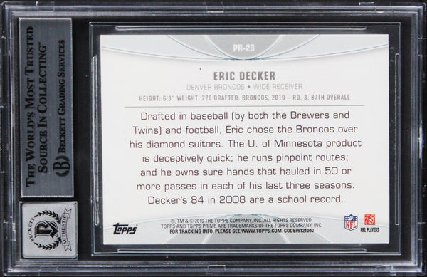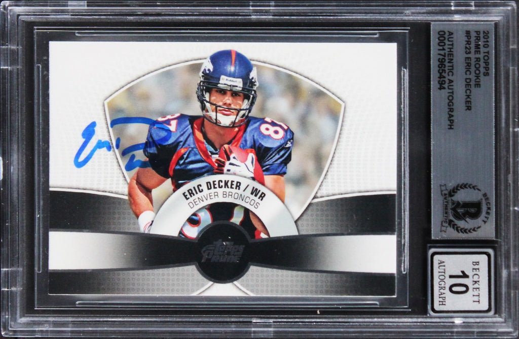 This Autographed Auto Graded Gem Mint 10! 2010 Topps Prime Rookie #PR23 Rookie Card has been Personally Signed by Eric Decker of the Denver Broncos. This item is 100% Authentic, it comes slabbed and authenticated by Beckett Authentication Services. The authenticity can be verified on Beckett Authentication Services website.