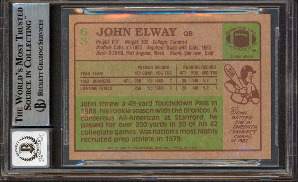This Autographed Auto Graded Gem Mint 10! 1984 Topps #63 Rookie Card has been Personally Signed by John Elway of the Denver Broncos. This item is 100% Authentic, it comes slabbed and authenticated by Beckett Authentication Services. The authenticity can be verified on Beckett Authentication Services website.