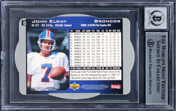 This Autographed Auto Graded Gem Mint 10! 1996 SPX #15 Card has been Personally Signed by John Elway of the Denver Broncos. This item is 100% Authentic, it comes slabbed and authenticated by Beckett Authentication Services. The authenticity can be verified on Beckett Authentication Services website.
