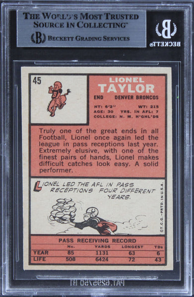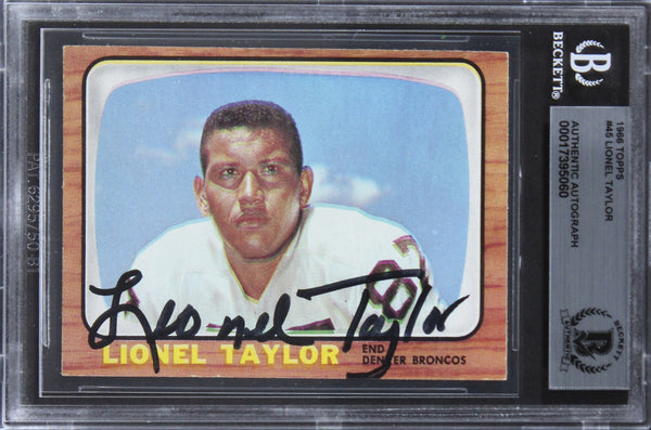 This Autographed 1966 Topps #45 Card has been Personally Signed by Lionel Taylor of the Denver Broncos. This item is 100% Authentic, it comes slabbed and authenticated by Beckett Authentication Services. The authenticity can be verified on Beckett Authentication Services website.